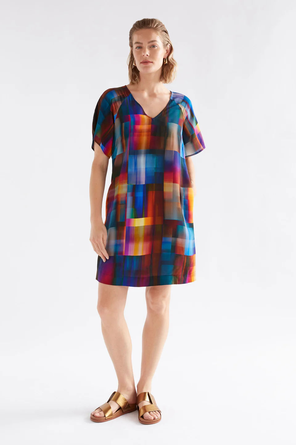 The Elk Byde Short Dress is a playful, warm weather style with thoughtful details, in the vibrant Ekko Print. This V-neck dress features short tulip, raglan sleeves that elongate and flatter the arm, while still ensuring coverage. Crafted from an ECOVERO™ viscose blend that is lightweight and has a silky, floaty drape and matte sheen. Designed with a regular-fit bust that falls into a gentle A-line silhouette, finishing at the knee.