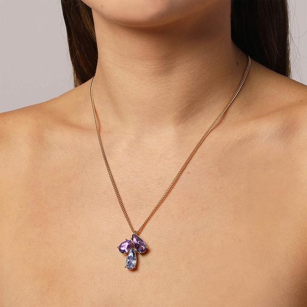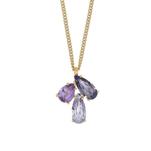 AVIRA - A fashionable and beautiful necklace that really stands out with its three large hand-cut and facetted handset crystals. The necklace is made in polished brass and has a quality plating. Here shown in a gold-tone version and lavender/violet toned crystals.