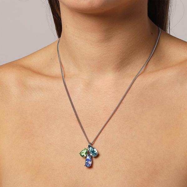AVIRA - A fashionable and beautiful necklace that really stands out with its three large hand-cut and facetted handset crystals. The necklace is made in polished brass and has a quality plating. Here shown in a silver-tone version and aqua /blue-toned crystals.