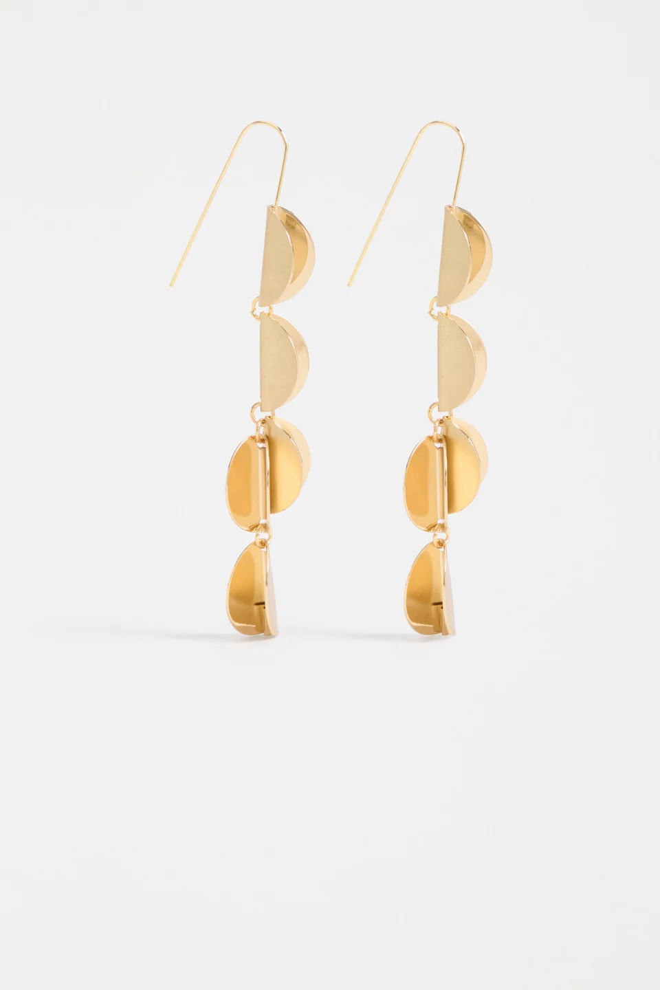 The Elk Fossen Drop Earrings features a row of folded metal discs with a brushed exterior finish affixed to a hook earring. The discs layer on top of each other to create depth and dimension and coordinate beautifully with the matching Fossen Necklace for a complete look.