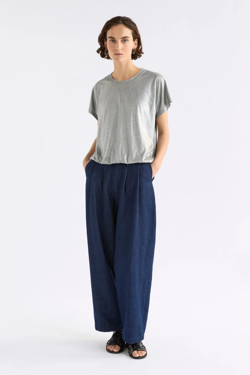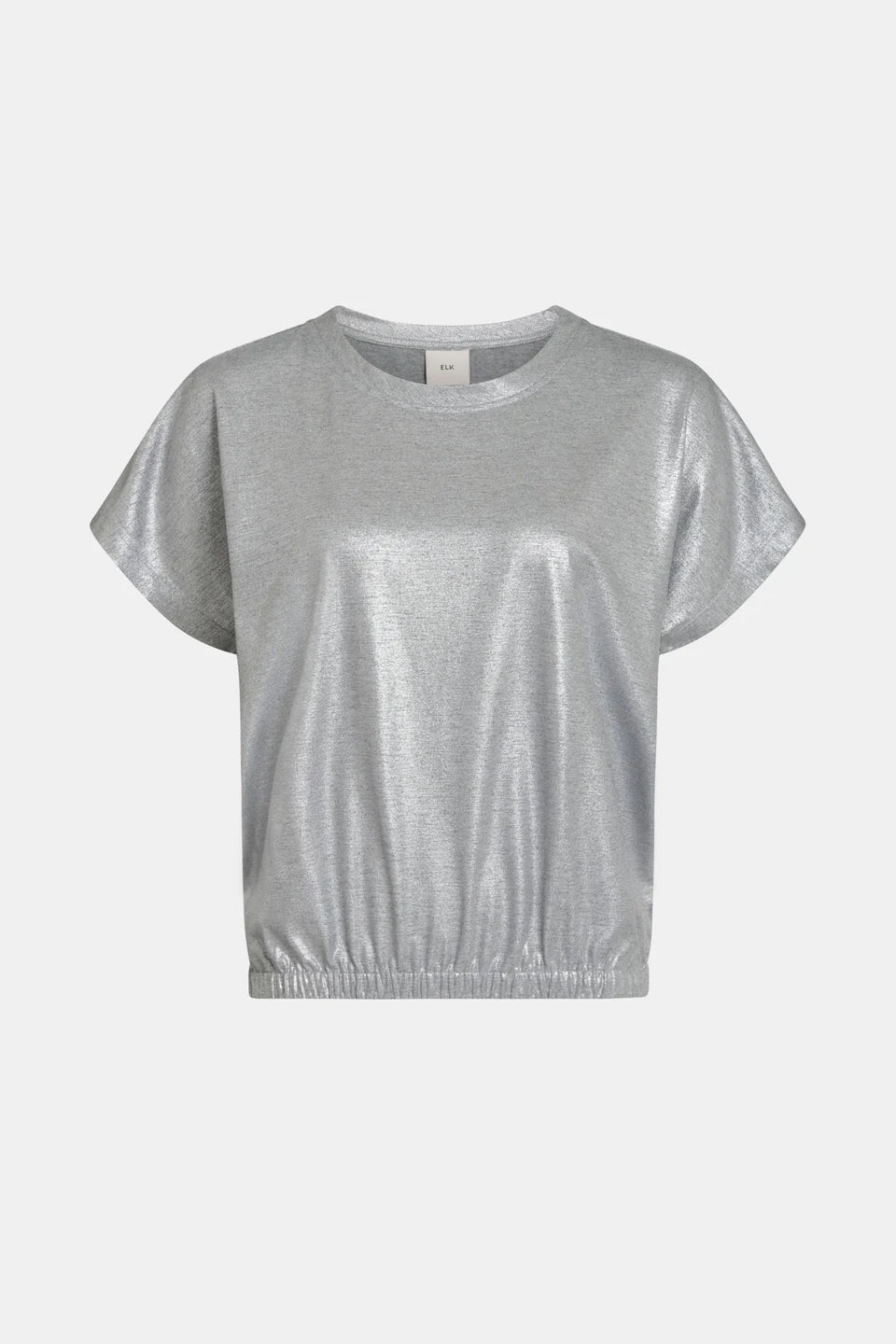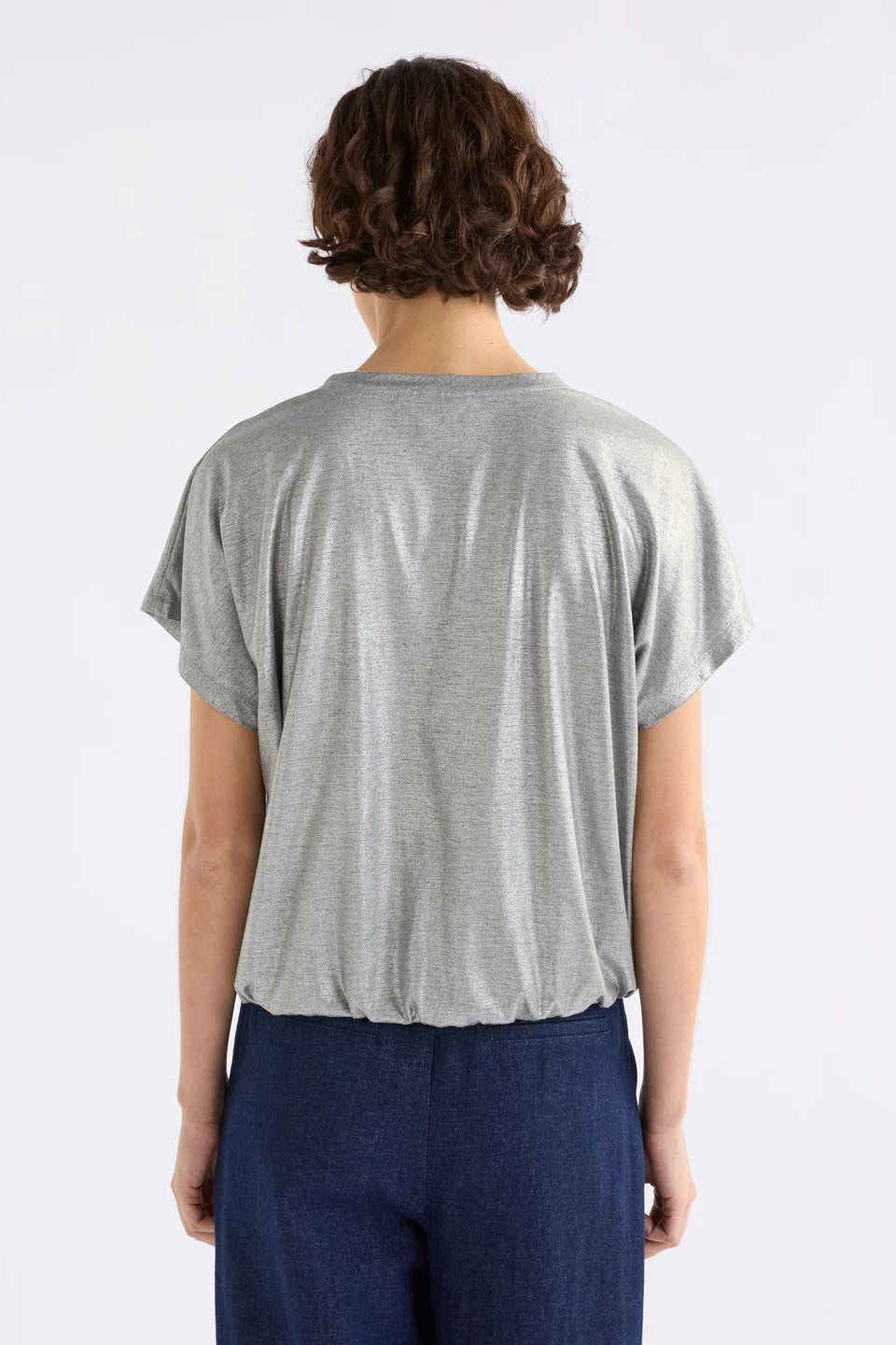The Elk Maail Tshirt is your classic t-shirt style with an unassuming edge. Crafted from a soft, lightweight jersey with a metallic foil finish that gives a glistening metallic sheen. This regular fit, classic crew tee is finished with a slightly cropped elasticated hem that gathers to create a blouson effect. Perfect for pairing with the matching Maail Skirt or styling with your favourite denim.